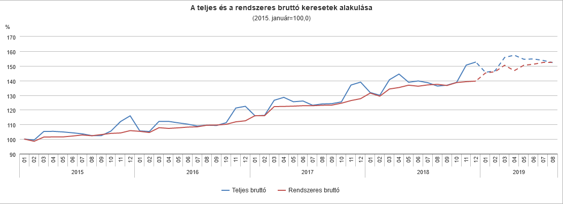 Úgy látszik, a magyar gazdasági növekedés nem tervezi, hogy akár a közeljövőben lelassul vagy megáll, és ezt a KSH adatai is tükrözik. 2019. január–augusztusban a bruttó átlagkereset 359 800, a nettó átlagkereset 239 300 forint volt, mindkettő 10,7%-kal nőtt az előző év azonos időszakához viszonyítva.