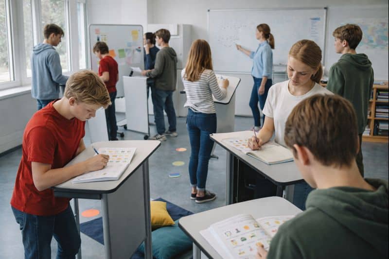 Természetesen nem katonai díszsorfalról beszélünk. Van pihenőzóna is, puha blokkokkal, ahol néhány percre le lehet ülni, és vannak döntött pultok, ahol támaszkodni lehet. A lényeg nem az állás, hanem a szabad választás: a diák maga dönti el, milyen pozícióban tud a legjobban működni.